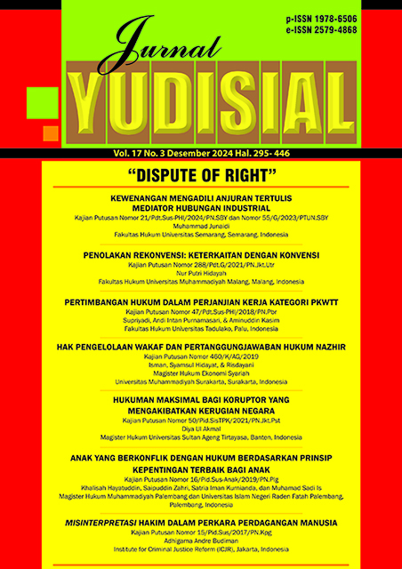 Tulisan ini menganalisis Putusan Nomor 460/K/AG/2019 dari perspektif nalar profetik dalam kaitannya dengan perbuatan melawan hukum oleh nazhir perseorangan yang menelantarkan tanah wakaf. Putusan Mahkamah Agung tersebut dilatarbelakangi oleh gugatan penggantian nazhir perseorangan yakni YK dan DD yang diajukan oleh SA (nazhir badan hukum) dan KRA (ahli waris wakif). Dengan dasar pertimbangan surat pernyataan wakif tanggal 23 Mei 2013 tentang penggantian nazhir perseorangan menjadi nazhir badan hukum. Penelitian ini menggunakan metode yuridis filosofis dengan pendekatan deskriptif analitis untuk menguraikan pertimbangan hukum Mahkamah Agung dan konsep keadilan transendental. Hasil penelitian menunjukkan bahwa pertimbangan Mahkamah Agung telah memenuhi prinsip-prinsip penalaran profetik. Selain itu, majelis hakim mempertimbangkan keabsahan formal penggantian nazhir perseorangan menjadi nazhir berbadan hukum dan prinsip-prinsip keadilan wakaf yang mengharuskan penggunaan tanah wakaf untuk pendidikan, dakwah, dan kegiatan sosial keagamaan. Prinsip-prinsip ini terkait dengan aspek ‘nilai’ dan ‘norma’. Mahkamah Agung memutuskan bahwa seorang nazhir perorangan telah bertindak secara ilegal karena aset wakaf tersebut telah disalahgunakan selama kurang lebih 28 tahun. Selain itu, nazhir perorangan juga dianggap lalai dan gagal memanfaatkan harta benda wakaf untuk tujuan yang diinginkan oleh wakif. Akibatnya, wakaf mengalami kerugian yang signifikan karena hilangnya potensi manfaat dari harta benda wakaf tersebut. Selain itu, keputusan Pengadilan Tinggi Agama Samarinda mengenai penggantian nazhir perseorangan menjadi nazhir berbadan hukum dibatalkan oleh Mahkamah Agung karena tidak mengikuti prosedur yang benar. Keputusan tersebut didasarkan pada kontekstualisasi dari aspek sosio-religius, sosio-filosofis, dan sosio-kultural.